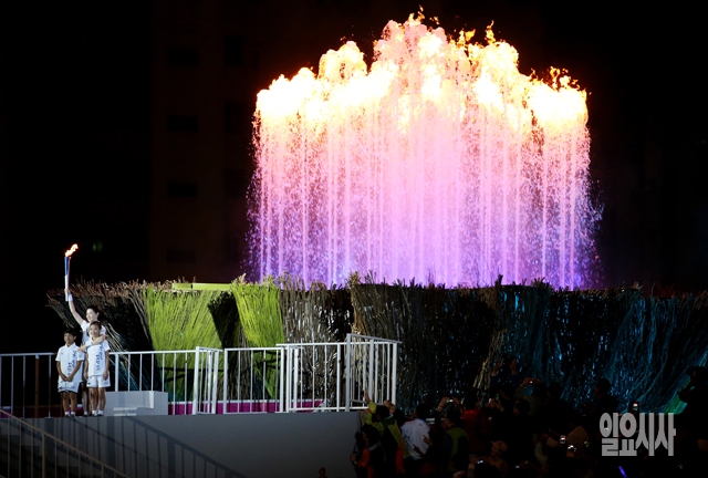 2014 인천아시아경기대회 개막일인 19일 인천아시아드주경기장에서 열린 개회식에서 배우 이영애와 아이들이 성화를 점화하고 있다.