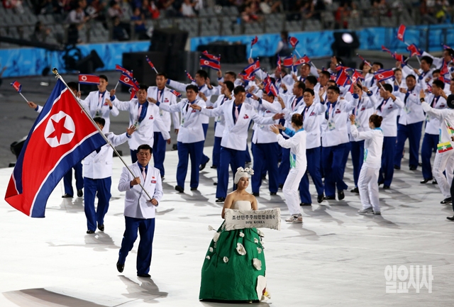 2014 인천아시아경기대회 개막일인 19일 인천아시아드주경기장에서 열린 개회식에서 북한 선수단이 입장하고 있다.