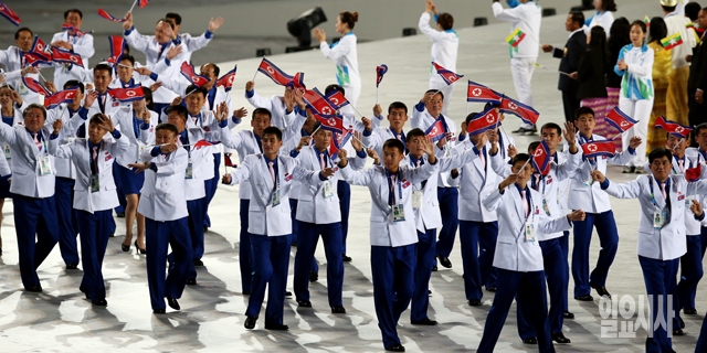 2014 인천아시아경기대회 개막일인 19일 인천아시아드주경기장에서 열린 개회식에서 북한 선수단이 입장하고 있다.