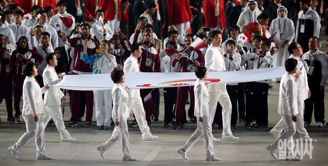 2014 인천아시아경기대회 개막일인 19일 인천아시아드주경기장에서 열린 개회식에서 대회기가 입장하고 있다.