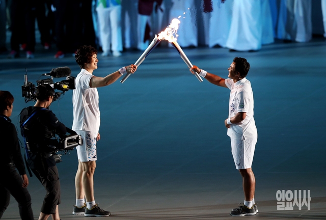 2014 인천아시아경기대회 개막일인 19일 인천아시아드주경기장에서 열린 개회식에서 성화주자인 박찬숙 전 농구선수(왼쪽)가 이형택 테니스선수에게 성화를 전달하고 있다.