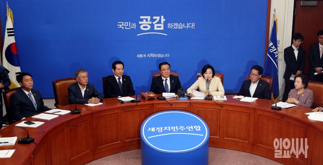박영선 새정치민주연합 원내대표가 22일 서울 여의도 국회에서 열린 제1차 비상대책위원회 회의에서 모두발언을 하고 있다. 왼쪽부터 조정식 사무촌장, 문재인, 정세균 비대위원, 문희상 비대위원장, 박 원내대표, 박지원, 인재근 비대위원.
