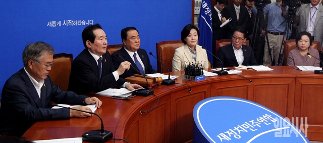 정세균 새정치민주연합 비대위원(왼쪽에서 두번째)이 22일 서울 여의도 국회에서 열린 제1차 비상대책위원회 회의에서 모두발언을 하고 있다.