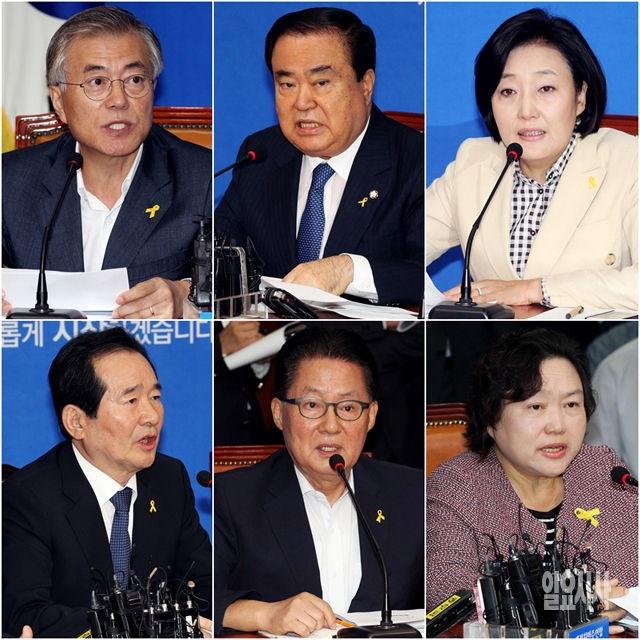 22일 서울 여의도 국회에서 열린 새정치민주연합 제1차 비상대책위원회 회의에 참석한 문희상 비대위원장, 박영선 원내대표를 비롯한 비대위원들이 모두발언을 하고 있다. 윗줄 왼쪽부터 시계방향으로 문재인, 문희상, 박영선, 인재근, 박지원, 정세균.