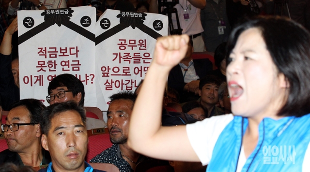 22일 서울 여의도 국회 의원회관에서 열린 '공무원연금 개혁을 위한 정책토론회'가 전국공무노동조합 조합원의 반발로 무산됐다. 한국연금학회 주최로 열린 이날 토론회에서 전국공무원노동조합 조합원 300여명이 참석해 토론회가 시작되기 전 정부와 여당을 규탄하며 구호를 외치고 항의하고 있다.