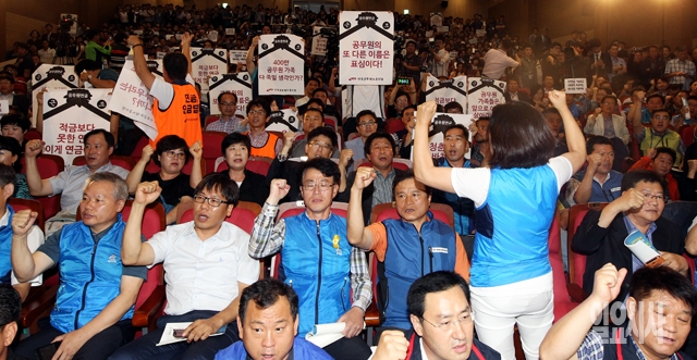22일 서울 여의도 국회 의원회관에서 열린 '공무원연금 개혁을 위한 정책토론회'가 전국공무노동조합 조합원의 반발로 무산됐다. 한국연금학회 주최로 열린 이날 토론회에서 전국공무원노동조합 조합원 300여명이 참석해 토론회가 시작되기 전 정부와 여당을 규탄하며 구호를 외치고 항의하고 있다.