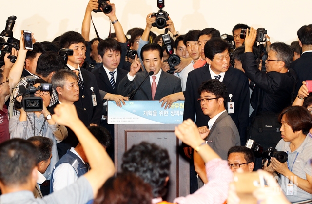 22일 서울 여의도 국회 의원회관에서 열린 '공무원연금 개혁을 위한 정책토론회'가 전국공무노동조합 조합원의 반발로 무산됐다. 한국연금학회 주최로 열린 이날 토론회에서 전국공무원노동조합 조합원 300여명이 참석해 토론회가 시작되기 전 새누리당 나성린 정책위수석부의장 발언에 항의하고 있다.