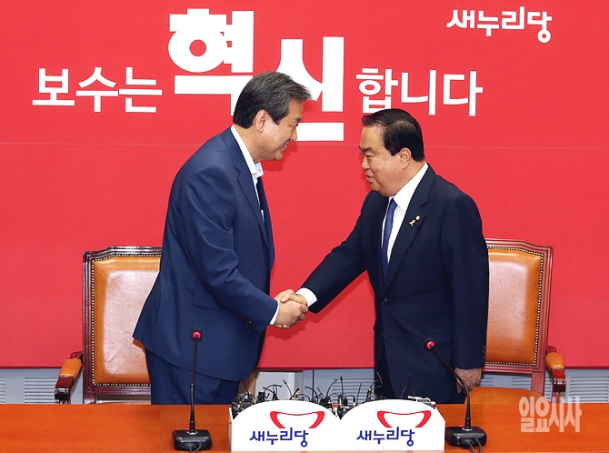 22일 오후, 새누리당 김무성 대표(사진 왼쪽)와 새정치민주연합 문희상 비상대책위원장이 서울 여의도 국회 새누리당 당대표실 회동에서 악수를 나누고 있다.