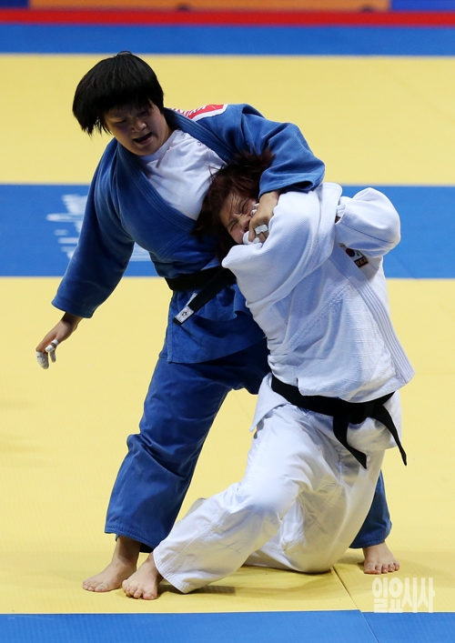 정경미(흰색 도복)가 22일 인천 도원체육관에서 열린 2014 인천 아시안게임 유도 여자 78kg급 결승전에서 북한의 설경을 상대로 경기를 펼치고 있다.