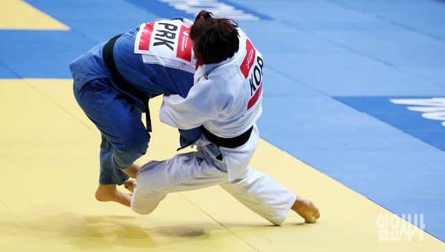 정경미(흰색 도복)가 22일 인천 도원체육관에서 열린 2014 인천 아시안게임 유도 여자 78kg급 결승전에서 북한의 설경을 상대로 공격을 하고 있다.