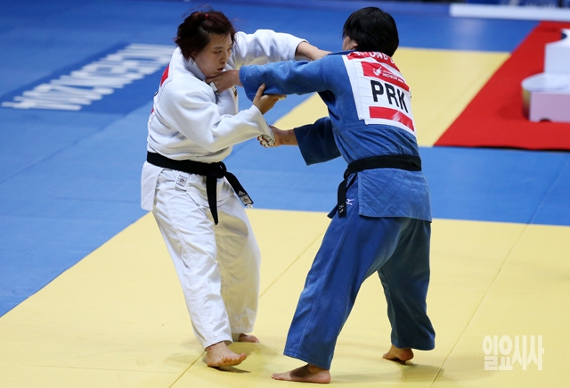 정경미(흰색 도복)가 22일 인천 도원체육관에서 열린 2014 인천 아시안게임 유도 여자 78kg급 결승전에서 북한의 설경을 상대로 공격을 하고 있다.