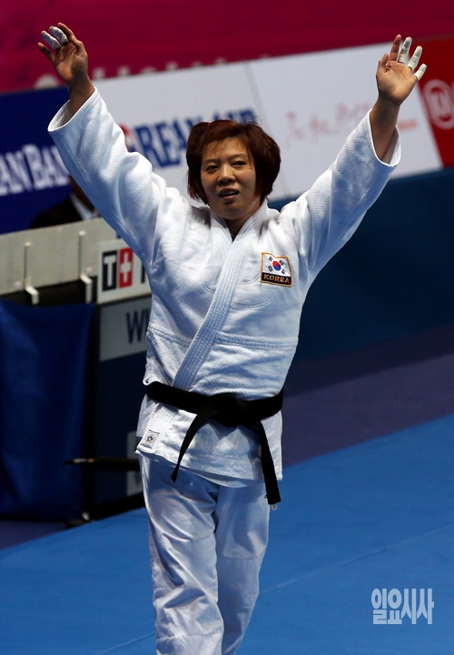 정경미가 22일 인천 도원체육관에서 열린 2014 인천 아시안게임 유도 여자 78kg급 결승전에서 북한의 설경을 상대로 우세승을 거둔 뒤 두 손을 들어 기뻐하고 있다.