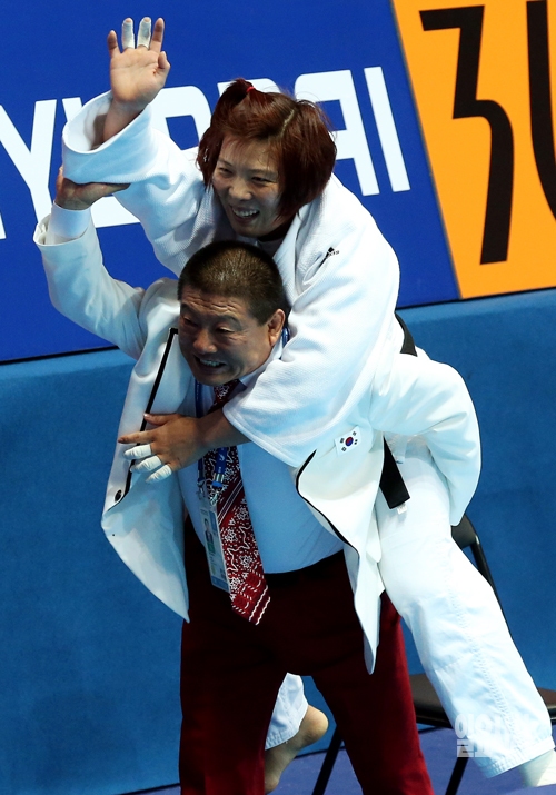 정경미가 22일 인천 도원체육관에서 열린 2014 인천 아시안게임 유도 여자 78kg급 결승전에서 북한의 설경을 상대로 우세승을 거둔 뒤 서정복 감독이 업어주고 있다.
