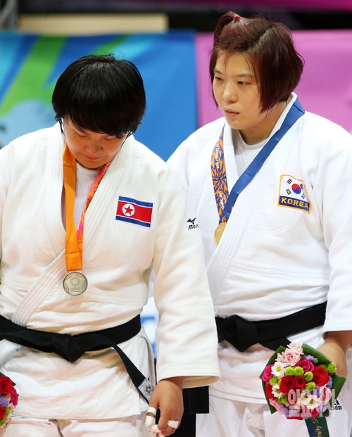 22일 인천 도원체육관에서 열린 2014 인천 아시안게임 유도 여자 78kg급 시상식에서 금메달리스트 정경미(오른쪽)가 은메달리스트 북한의 설경을 바라보고 있다.