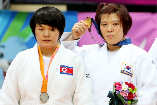 22일 인천 도원체육관에서 열린 2014 인천 아시안게임 유도 여자 78kg급 시상식에서 정경미(오른쪽)가 금메달을 들어보이고 있다. 왼쪽은 북한 설경 선수.
