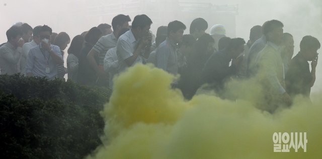 22일 서울 송파구 방이동 제2롯데월드에서 열린 민관합동종합방재훈련에서 시민들이 화재발생에 대한 대피를 하고 있다.