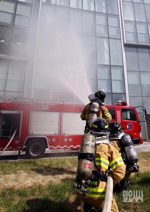 22일 서울 송파구 방이동 제2롯데월드에서 열린 민관합동종합방재훈련에서 119소방대원들이 화재진압을 하고 있다.