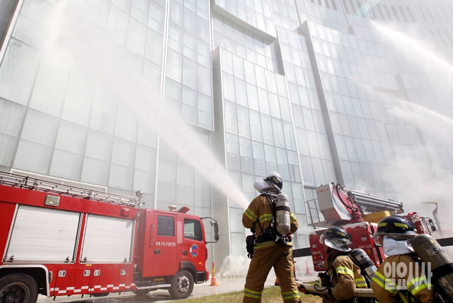 22일 서울 송파구 방이동 제2롯데월드에서 열린 민관합동종합방재훈련에서 119소방대원들이 화재진압을 하고 있다.