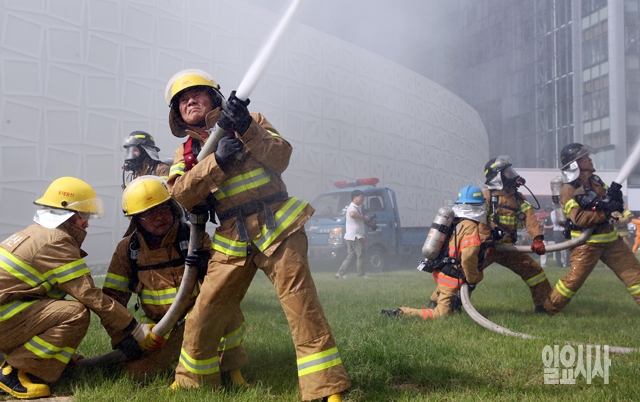 22일 서울 송파구 방이동 제2롯데월드에서 열린 민관합동종합방재훈련에서 119소방대원들이 화재진압을 하고 있다.