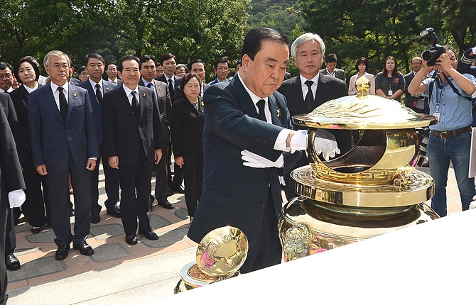23일 오전, 문희상 새정치민주연합 비상대책위원장이 서울 동작구 국립 현충원 김대중 전 대통령 묘소를 찾아 분향하고 있다.