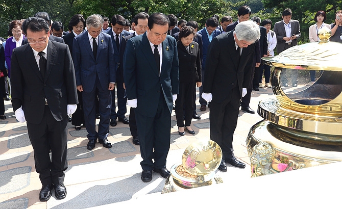 23일 오전, 문희상 새정치민주연합 비상대책위원장이 서울 동작구 국립 현충원 김대중 전 대통령 묘소를 찾아 분향하고 있다.