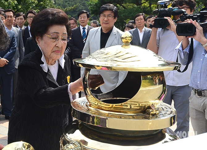 23일 오전, 문희상 새정치민주연합 비상대책위원장이 서울 동작구 국립 현충원 김대중 전 대통령 묘소를 찾은 가운데, 이희호 여사가 분향하고 있다.
