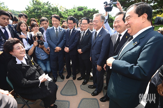 23일 오전, 문희상 새정치민주연합 비상대책위원장 등이 서울 동작구 국립 현충원 김대중 전 대통령 묘소를 찾아 분향 후 화기애애한 분위기로 이희호 여사와 이야기를 나누고 있다.