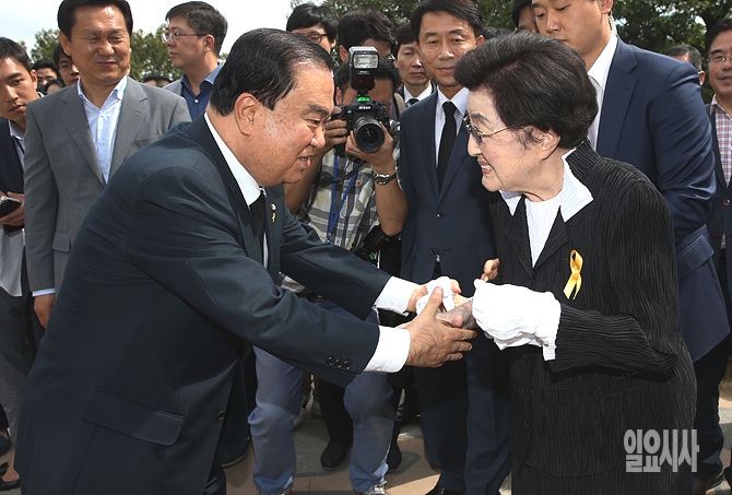 23일 오전, 문희상 새정치민주연합 비상대책위원장이 서울 동작구 국립 현충원 김대중 전 대통령 묘소를 찾아 분향 후 이희호 여사와 악수를 나누고 있다.