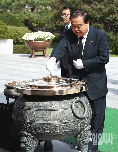 23일 오전, 문희상 새정치민주연합 비상대책위원장이 서울 동작구 국립 현충원을 찾아 분향하고 있다.