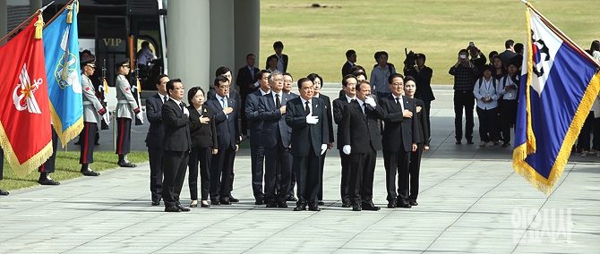 23일 오전, 문희상 새정치민주연합 비상대책위원장이 인재근 비대위원 등과 함께 서울 동작구 국립현충원 참배 도중 국기에 대한 경례를 하고 있다.