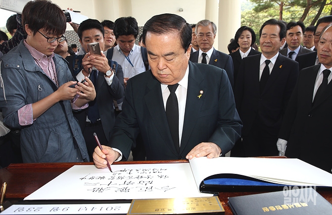23일 오전, 문희상 새정치민주연합 비상대책위원장이 서울 동작구 국립현충원 참배 직후 방명록을 작성하고 있다.
