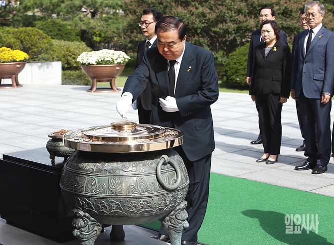 23일 오전, 문희상 새정치민주연합 비상대책위원장이 서울 동작구 국립현충원 참배 도중 분향을 하고 있다.