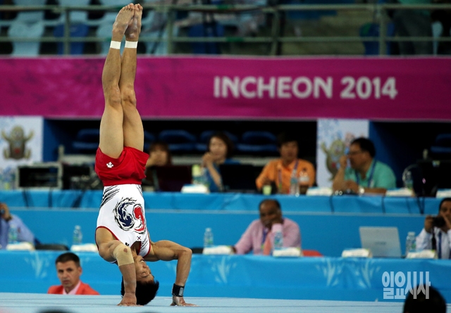 23일 인천 남동체육관에서 열린  2014 인천 아시안게임 남자체조 개인종합에 출전한 대한민국 이상욱 선수가 마루운동 연기를 하고 있다.