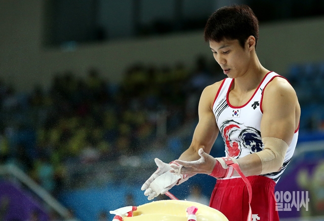 23일 인천 남동체육관에서 열린  2014 인천 아시안게임 남자체조 개인종합에 출전한 대한민국 이상욱 선수가 송진가루를 묻히고 있다.