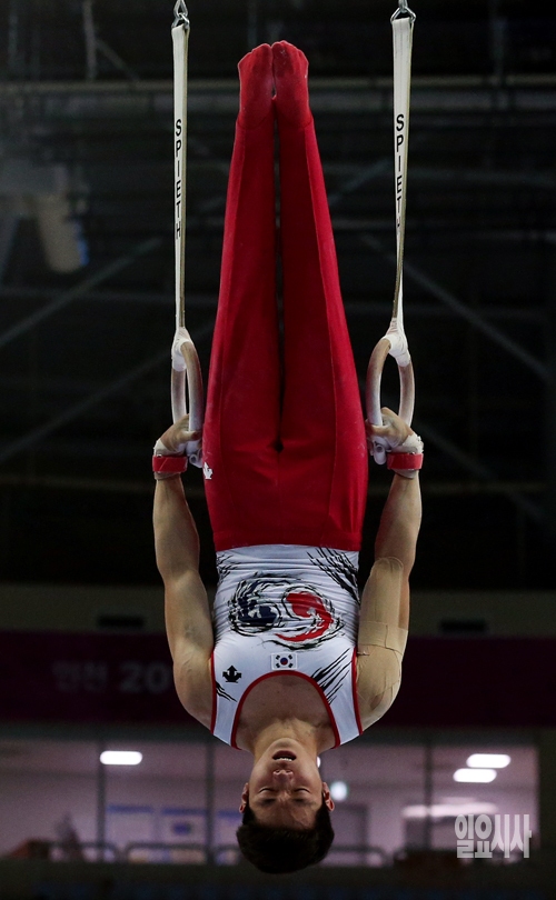 23일 인천 남동체육관에서 열린  2014 인천 아시안게임 남자체조 개인종합에 출전한 대한민국 박민수 선수가 링 연기를 하고 있다.