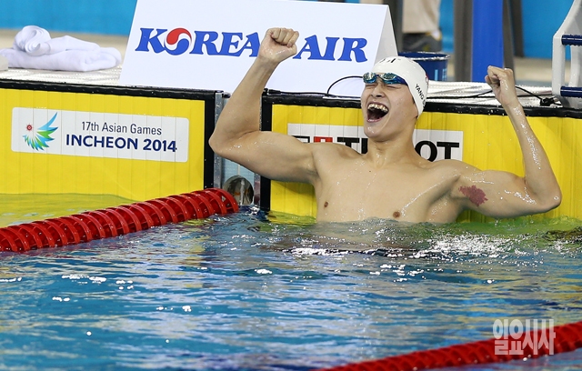 중국 쑨양이 23일 인천 문학박태환수영장에서 열린 2014 인천 아시안게임 수영 남자 400m 자유형 결선에서 1위로 들어온 뒤 포효하고 있다.