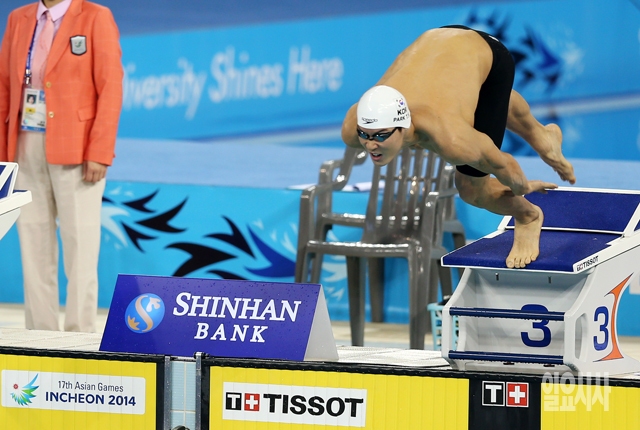 박태환이 23일 인천 문학박태환수영장에서 열린 2014 인천 아시안게임 수영 남자 400m 자유형 결선에서 스타트를 하고 있다.