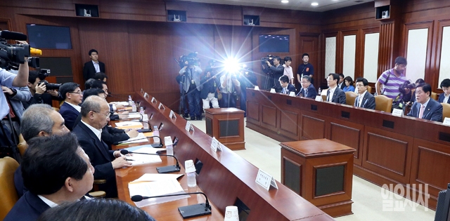 최경환 경제부총리 겸 기획재정부 장관(맨 오른쪽)이 24일 서울 세종로 정부서울청사에서 열린 경제관계장관회의에서 모두발언을 하고 있다.