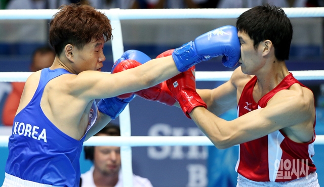 구교성이 24일 인천 선학체육관에서 열린 2014 인천 아시안게임 복싱 69Kg 웰터급 32강전 경기에서 일본의 스즈키 야쉬로를 상대로 공격을 시도하고 있다.