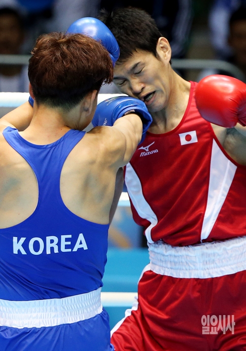 구교성이 24일 인천 선학체육관에서 열린 2014 인천 아시안게임 복싱 69Kg 웰터급 32강전 경기에서 일본의 스즈키 야쉬로를 상대로 공격을 시도하고 있다.