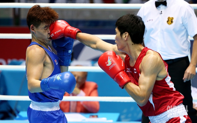 구교성이 24일 인천 선학체육관에서 열린 2014 인천 아시안게임 복싱 69Kg 웰터급 32강전 경기에서 일본의 스즈키 야쉬로를 상대로 접전을 벌이고 있다.