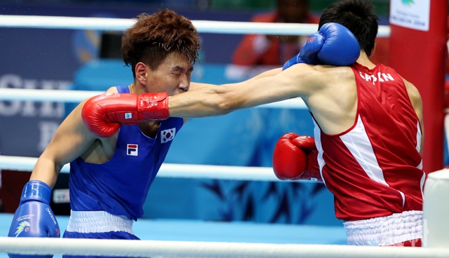 구교성이 24일 인천 선학체육관에서 열린 2014 인천 아시안게임 복싱 69Kg 웰터급 32강전 경기에서 일본의 스즈키 야쉬로를 상대로 공격을 시도하고 있다.