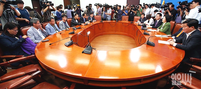 박영선 새정치민주연합 원내대표 등 지도부가 24일 오후 서울 여의도 국회 원내대표회의실에서 대리기사 폭행 사건으로 사퇴한 집행부에 이어 새로 선임된 세월호가족대책위 집행부와 면담을 나누고 있다.