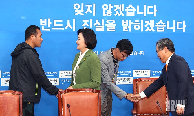 우윤근 새정치민주연합 정책위의장(사진 오른쪽)이 24일 오후 서울 여의도 국회 원내대표회의실에서 대리기사 폭행 사건으로 사퇴한 집행부에 이어 새로 선임된 세월호가족대책위 전명선 위원장(사진 오른쪽에서 두 번째)과 악수를 나누고 있다.