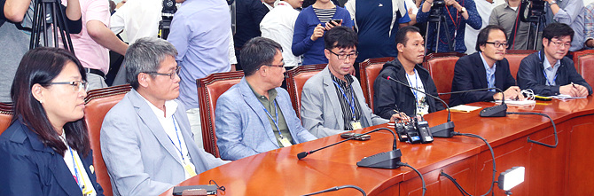 24일 오후 서울 여의도 국회 원내대표회의실에서 대리기사 폭행 사건으로 사퇴한 집행부에 이어 새로 선임된 세월호가족대책위 집행부가 새정치민주연합 지도부와 만나 면담을 나누고 있다.