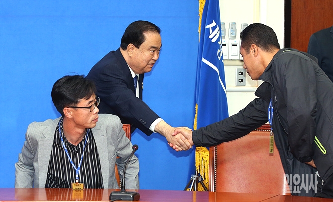 23일 오후, 서울 여의도 국회 새정치민주연합 당대표실에서 신임 세월호가족대책위원회 관계자가 문희상 비상대책위원장과 면담 직전, 악수를 하고 있다.