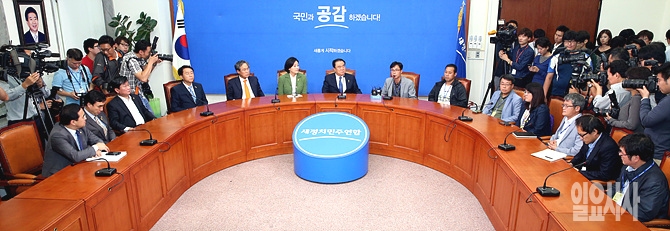 23일 오후, 서울 여의도 국회 새정치민주연합 당대표실에서 신임 세월호가족대책위원회 지도부가 문희상 비상대책위원장 등과 면담하고 있다.