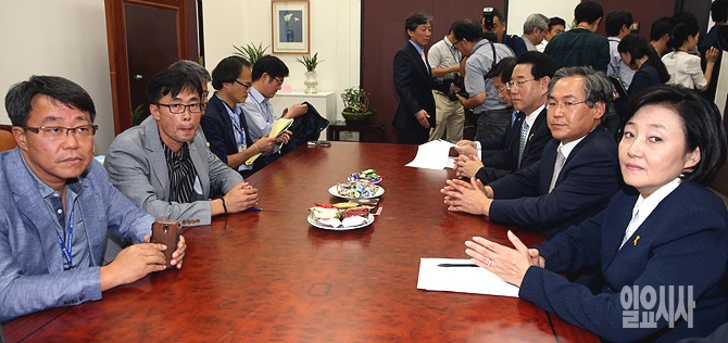 25일 오후, 서울 여의도 국회에서 박영선 새정치민주연합 원내대표와 전명선 신임 세월호가족 대책위원장 등이 면담을 갖고 있다.