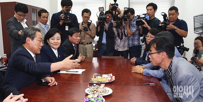 25일 오후, 서울 여의도 국회에서 신임 세월호가족 대책위원 지도부와 새정치민주연합 지도부가 면담을 갖고 있는 가운데, 우윤근 정책위의장(사진 왼쪽)이 발언하고 있다.