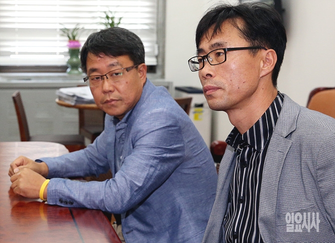 25일 오후, 서울 여의도 국회에서 박영선 새정치민주연합 원내대표와 전명선 신임 세월호가족 대책위원 지도부가 면담을 갖고 있는 가운데, 전 위원장이 새정치연합 우윤근 정책위의장의 발언을 경청하고 있다.